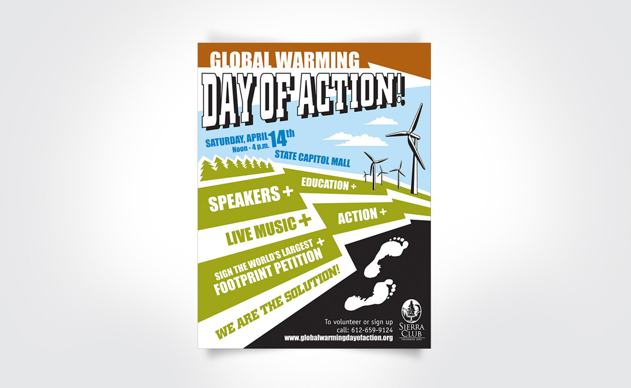 Worked closely with Sierra Club chapter staff to create a campaign to drive awareness for their Global Warming Day of Action initiative. Creative direction, design, production.